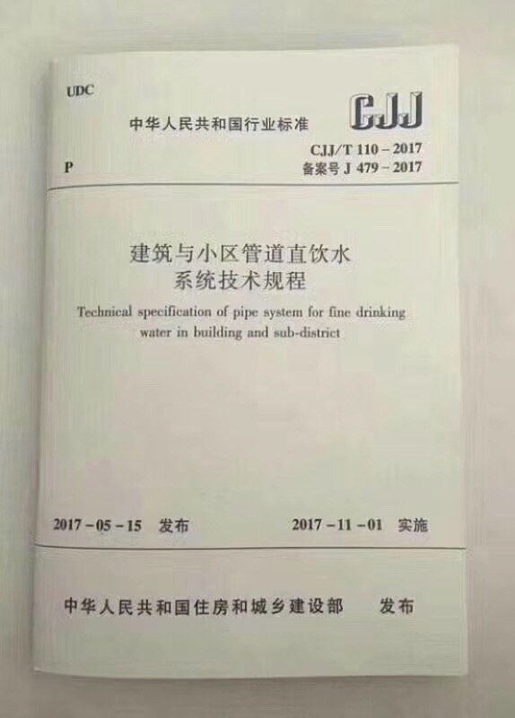 住房城乡建设部关于发布行业标准《建筑与小区管道直饮水系统技术规程》为行业标准,编号为CJJ/T 110-2017,自2017年11月1日起实施。原行业标准《管道直饮水系统技术规程》CJJ/T 110-2206同时废止。