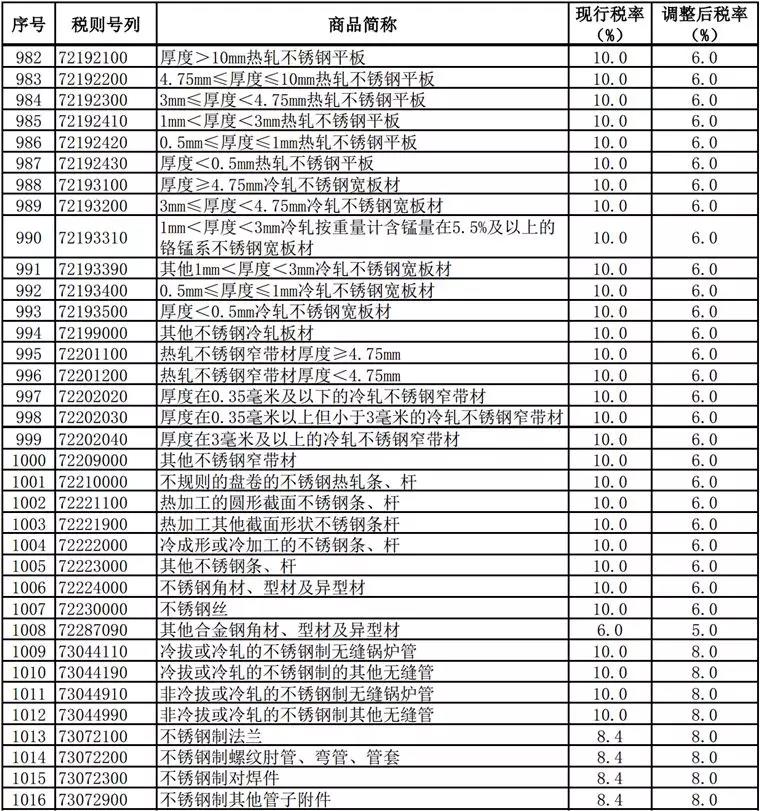 因好惠国税率调整,自2018年11月1日起,取消39项进口商品好惠国暂定税率,其余商品好惠国暂定税率继续实施。 特此公告。 其中进口商品好惠国税率调整表(不锈钢相关部分)