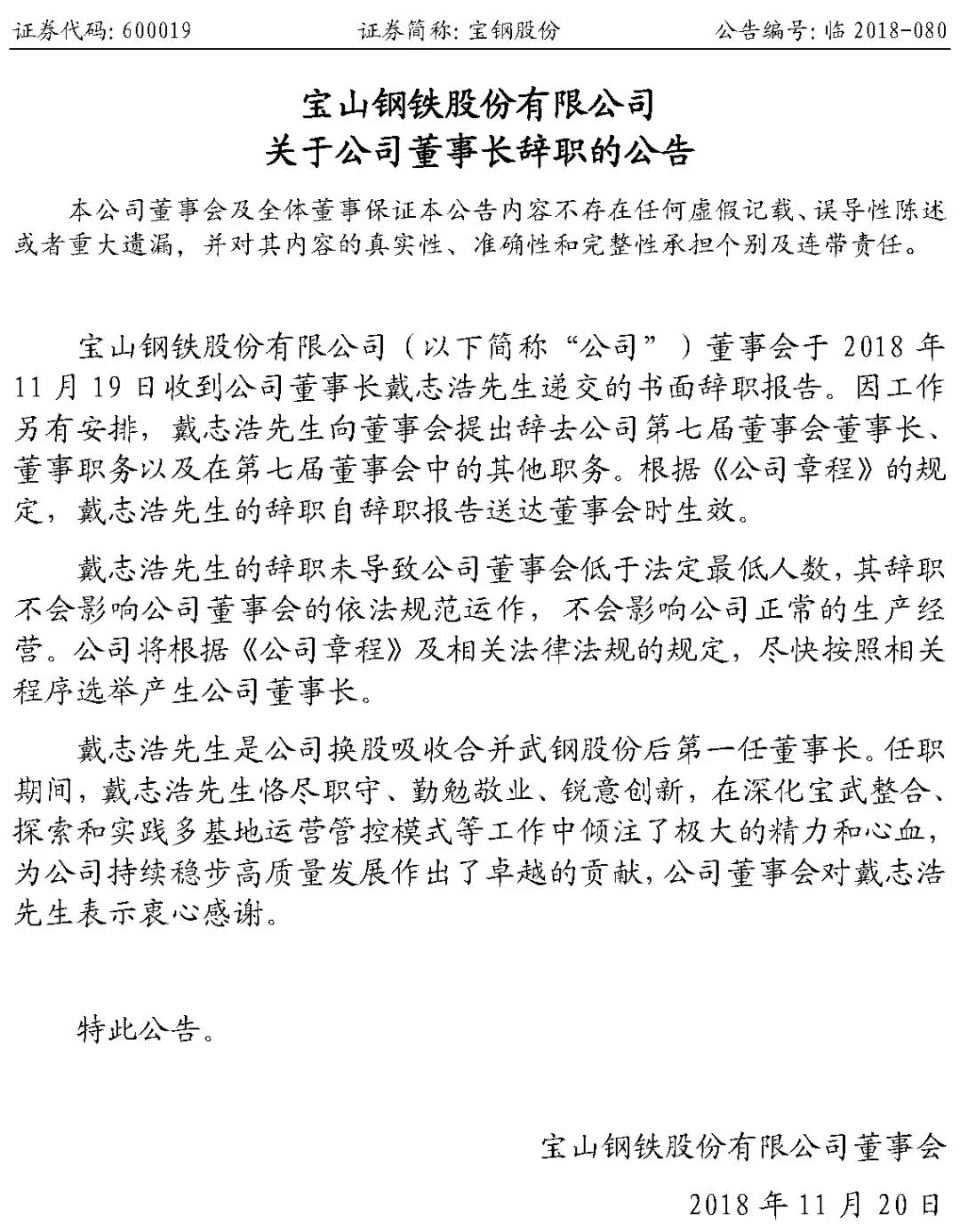 2018年11月19日下午,“钢铁航母”中国宝武旗下上市公司宝山钢铁股份有限公司发布公告,董事会于2018年11月19日收到公司董事长戴志浩先生递交的书面辞职报告。因工作 另有安排,戴志浩向董事会提出辞去公司第七届董事会董事长、 董事职务以及在第七届董事会中的其他职务。